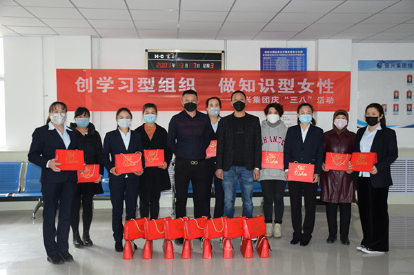 在慶祝三八婦女節(jié)儀式上,集團(tuán)公司副董事長鄭龍和副總經(jīng)理蘭小偉為全體女職工發(fā)放了福利并合影。